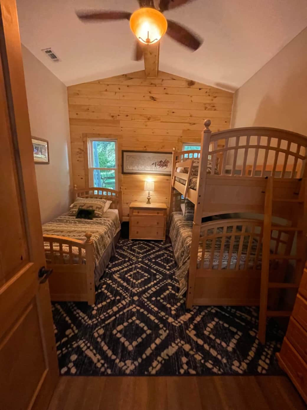 This is our 'kids' bedroom. This room features a vaulted ceiling, stacked twin bunk beds, and a single twin bed with plenty of room for 3 to sleep comfortably. There is a full dresser, a nightstand and a closet so that you can unpack your suitcase and feel right at home.